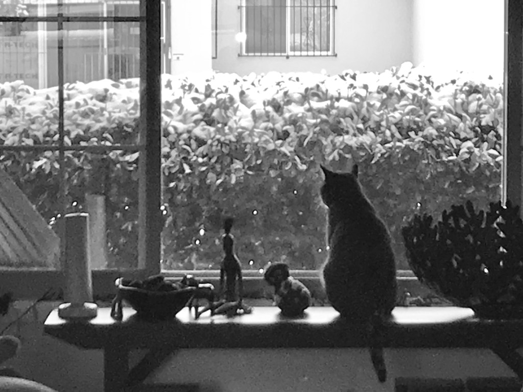 So, instead of escaping the gray, I got a different shade of it. Instead of gray and wet, I got gray, cold and as the Scots would say, “big ‘blin drifts’ on your streets” and “real ‘spitters’ coming down.” Trapped in a beautiful house with a hot tub and a big screen T.V., with two great cats, my cute husband and a full fridge (after the most chaotic trip to Costco I’ve ever had in my life). I guess it could get worse.